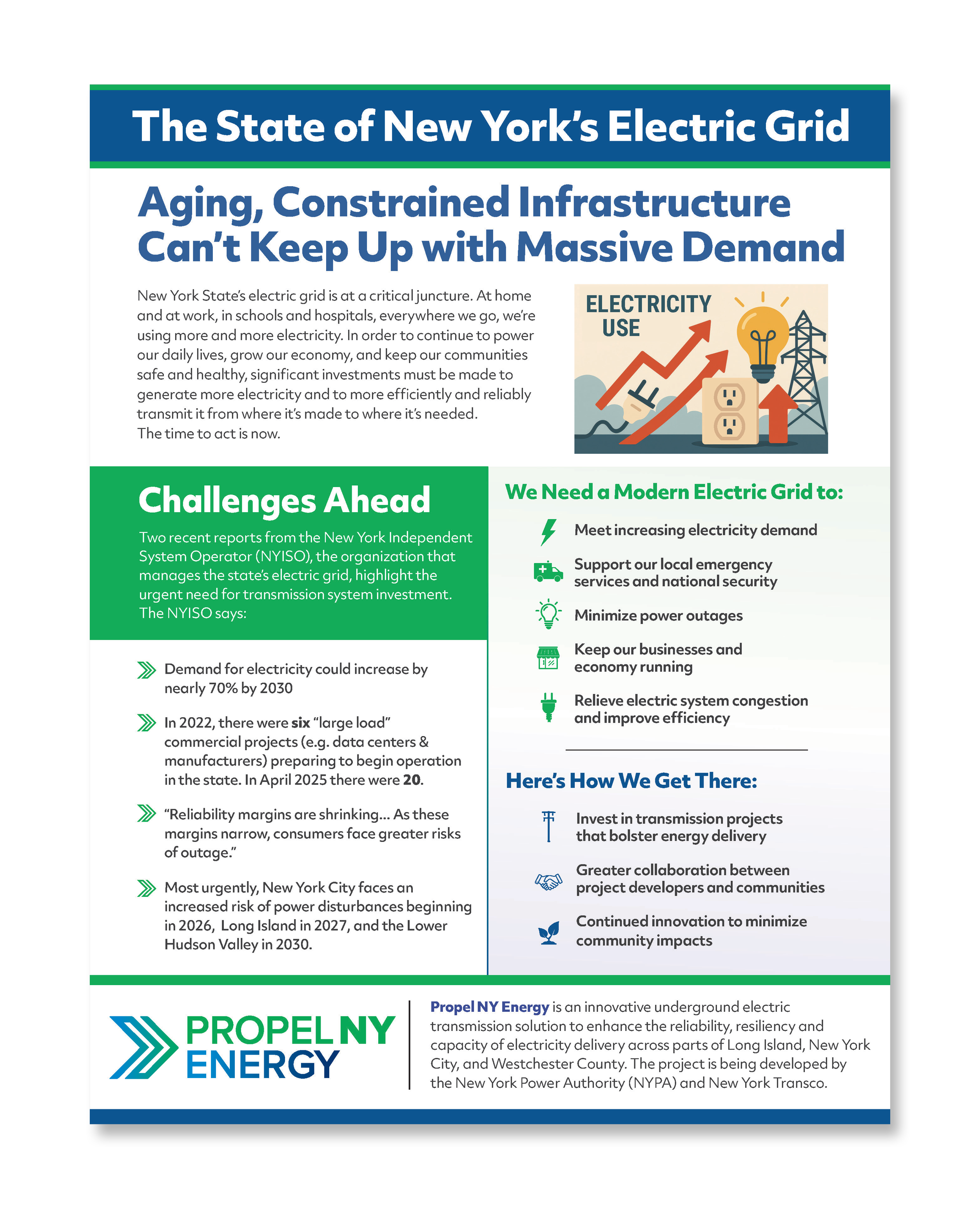 Our nation’s – and New York State’s – electric grid is at a critical juncture. Demand for electricity is rising quickly and our aging, constrained electric transmission infrastructure needs to be modernized and expanded to meet our growing needs. Learn more about the importance of our transmission system and the challenges it faces using the resources below.